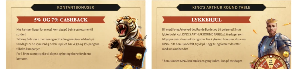 Bortsett fra cashback, trenger du en bonuskode for å hente de andre bonusene. Selv bonusene i velkomstpakken krever en bonuskode. Etter at du har hentet hver velkomstbonus, vil du motta en matchbonus. På innskudd en og to mottar du også gratisspinn for å gjøre bonusen ekstra attraktiv.